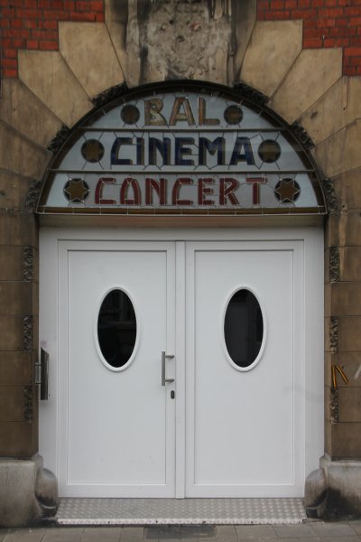 La région est bien connue par son carnaval et ses salles de fêtes. En revanche, Il est assez inattendu de trouver une enseigne en vitrail annonçant les activités culturelles avec un éclairage ingénieux : cinéma, concert ou bal. On appréciera le lettrage et les effets de perspective. Le verre martelé laisse passer la lumière sans dévoiler le dispositif d’éclairage. Les panneaux de grande taille ont été déposés et transportés avec le plus grand soin. Le panneau « cinéma » comportait trois lacunes importantes sur les deux côtés. Après une longue recherche, nous avons finalement trouvé chez un fournisseur spécialié les verres chenillés blancs opalescents. Un verre imprimé jaune introuvable a été restitué par thermoformage. Vu sa grande taille, le réseau de plomb avait fortement souffert. Nous l’avons remis sous plomb complètement en respectant les différentes largeurs de profils utilisées. Les deux autres panneaux en meilleur état ont fait l’objet de consolidations ponctuelles. Pour protéger le vitrail et pérenniser les restaurations, une verrière de protection a été mise en place. Et que le spectacle continue….