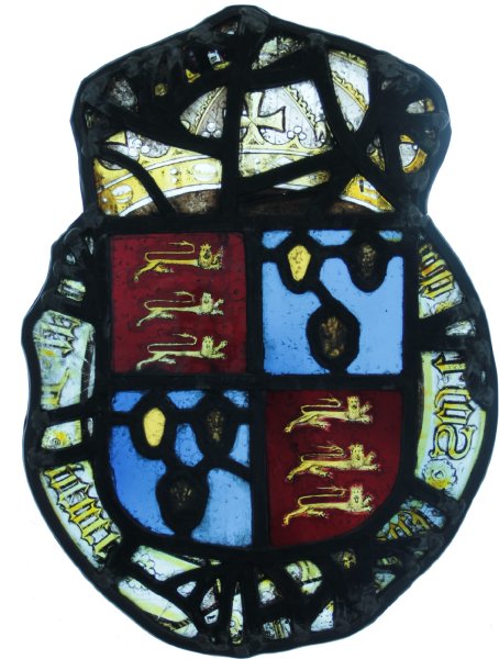 L’étude du blason a été ma première étude d’un panneau médiéval. L’étude de l’iconographie (Lys sur fond bleu et lions sur fond rouge) a permis d’identifier les rois anglais qui ont porté ce blason entre le 15 et le début du 16ème siècle. Autour du blason se lit la devise en français de la couronne anglaise (toujours en vigueur aujourd’hui) : « honni soit qui mal y pense ». L’examen des marques sur le plomb et l’étude historiographique ont permis de localiser la provenance exacte du blason dans la cathédrale de York. L’étude matérielle m’a permis d’observer des petits trous à la surface du verre résultant d’un processus de dégradation.Au microscope, ils apparaissent comme des cratères. Le panneau étant stable, il ne nécessitait pas selon moi d’intervention majeure. On pourrait envisager d’enlever les plombs de réparations et effectuer des collages pour améliorer la lisibilité de l’inscription. J’ai prévu toutefois de conserver ces réparations pour montrer au public les techniques de consolidation employées dans le passé. J’ai recommandé de présenter le panneau dans un caisson rétroéclairé à proximité de la verrière d’où il provenait. Ce travail m’a montré que l’étude approfondie du vitrail pouvait contribuer à sa valorisation auprès du public.