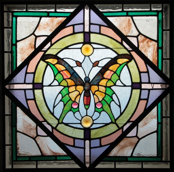Cette verrière zénithale apporte lumière, couleur et poésie dans une maison de maître liégeoise. Le grand panneau central était instable. Pourtant, en étant précautionneux lors de la dépose et des manipulations, c’est une restauration minimale qui a été mise en œuvre. Le réseau de plomb a été consolidé et renforcé par des vergettes. Les pièces de verre fêlées ont été conservées et recollées dans la mesure où elles ne perturbaient pas l’ensemble. Seule la pièce bleue au niveau de la tête du papillon, comportant des fêlures multiples, a été remplacée en raison de sa position centrale. Si l’éthique du restaurateur prescrit de préserver l’authenticité de l’œuvre en limitant ses interventions, il me semble important d’écouter l’avis du propriétaire et prendre ensemble la décision qui nous semble la plus adaptée.