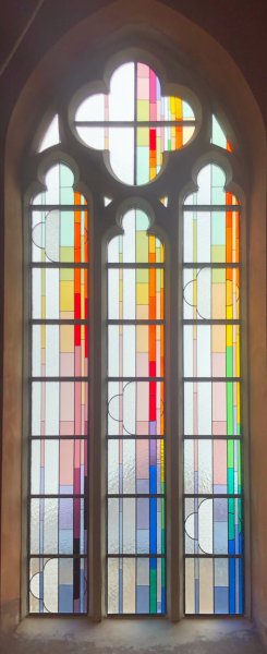 Les autres verrières en verre incolore étaient couvertes par des films auto-collant imitant les vitraux.