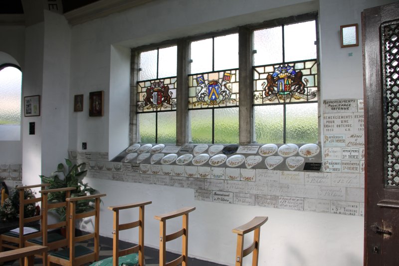 En lien avec la consécration de la chapelle, la verrière centrale représente Notre-Dame de l’apocalypse. Elle rend hommage à Louis-Joseph l’évêque Kerckhofs (1878-1962), 88ème évêque de Liège. Les vitraux ont été conçus par G. Monzee et réalisés par O.Condez en 1950.