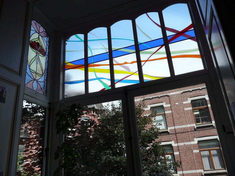Cette maison de maître située en Outremeuse comporte une loggia ornée par une verrière art déco. Les deux panneaux d’époque ont été restaurés et placés dans les fenêtres latérales. La création, inspirée par des foulards sous le vent, a été réalisée en alliant la mise en plomb traditionnelle et le fusing. Le projet a été mené à bien grâce à la collaboration de Jean-Yves Vossius et Olivier Auquier.