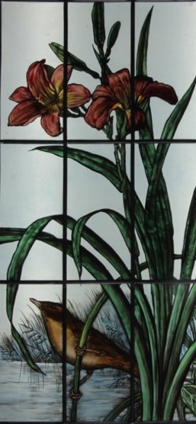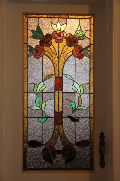 En vogue dans les années 1920-1930, le style art déco se reconnaît à la forme simplifiée des motifs, au tracé symétrique et à la texture des verres. Un nettoyage léger a mis en évidence une riche palette de couleurs : les nuances subtiles du feuillage contrastent avec les tons chauds des fleurs. Le peintre a également joué des textures du verre : opalin pour les fleurs, cathédrale pour le feuillage, goutte d’eau pour les fonds. Le plomb participe également à la composition : baguette plus étroite pour les motifs floraux - plus large pour la structure. Pour des raisons esthétiques, le propriétaire a souhaité remplacer les verres brisés, soit par des éléments venant d’un troisième panneau fort altéré soit par des pièces identiques. Vu l’état du plomb, les panneaux ont été remis sous plomb neuf. En plus des vergettes de soutien, nous avons inséré une tige métallique dans les plombs centraux pour un meilleur maintien. Nous avons rectifié le cadre abîmé et remplacé le joint de mastic par des parecloses en bois.