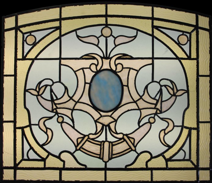 Tout dans cette demeure de Forest a fait l’objet d’un investissement décoratif. C’est la marque de l’architecture art nouveau d’avoir intégré les arts décoratifs dans un projet cohérent. Le vitrail est placé dans une porte entre l’escalier monumental et la cuisine. L’emploi de verre texturé donne du relief à la surface : chenillé, goutte d’eau, océanique, cathédrale. L’emploi de plomb de différentes largeurs distingue le motif central de la bordure. En y travaillant, j’ai eu l’impression d’un mobile suspendu, d’un objet flottant... Le panneau avait fait l’objet d’une restauration il y a sept ans. L’état du plomb s’est manifestement dégradé : de nombreuses soudures se sont fissurées, provocant une déformation du panneau. Nous avons procédé à une remise sous plomb neuf. Les casses en nombre limité ont été consolidées par collage avec un adhésif souple type silicone : résistance au mouvement de la porte, stabilité à la chaleur et l’humidité de la cuisine. Les parecloses moulurées ont été fortement endommagées par les interventions antérieures, elles ont été remplacées à l’identique par l’ébéniste Bernard Kaisin